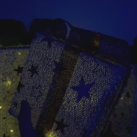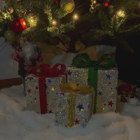Bright, warm LEDs shine through beautifully crafted Christmas gift box designs.